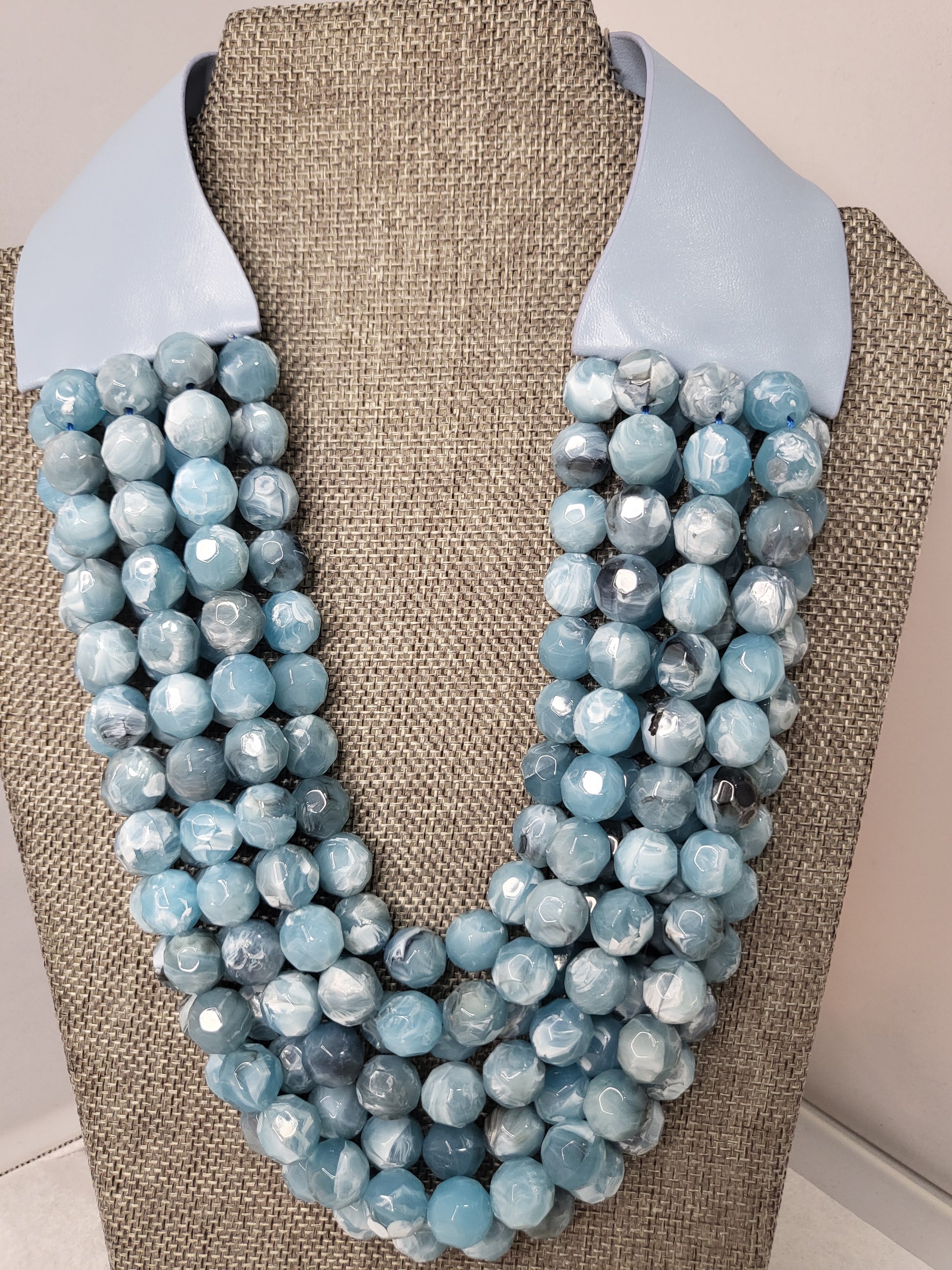 Multi-Layered Blue Adjustable Magnetic Beaded Necklace. Faux Leather Magnetic Closure.